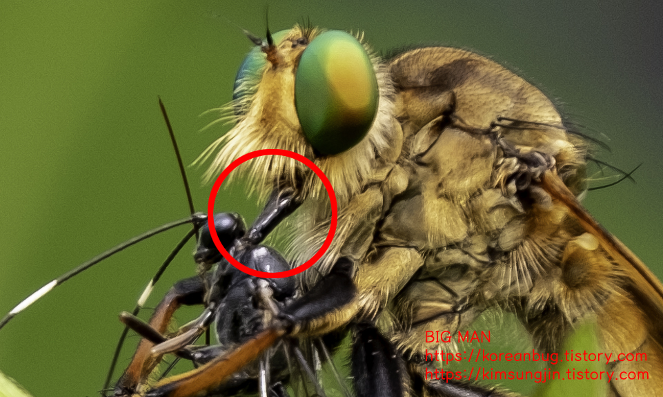 왕파리매의 강력한 주둥이 찔려보지 않은 사람은 그 느낌을 모른다. BIG MAN 역시 중학교 시절에 채집하다 찔려본적이 있습니다. 매우 아프지만 벌처럼 오래가지는 않았습니다.